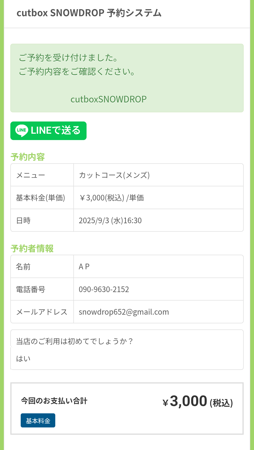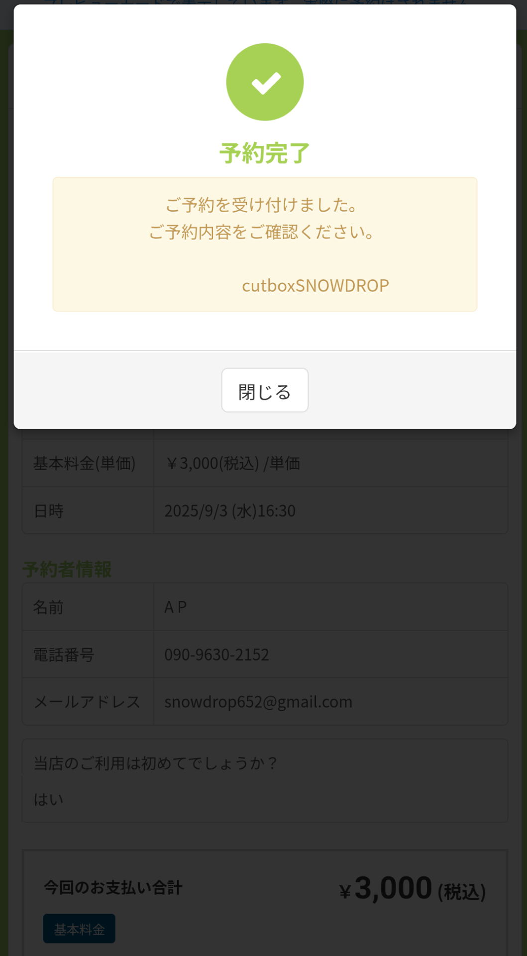 当店から予約直後と予約前日 にリマインドメールが届きますのでよろしくお願いいたします。
